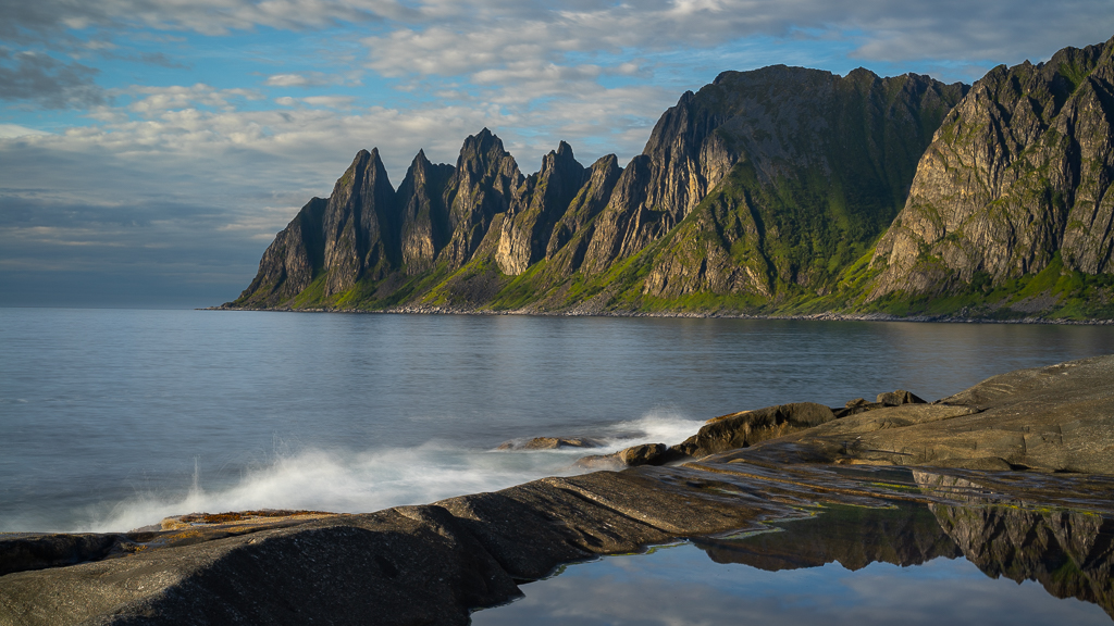 Tungeneset is at sea level and offers an awesome view of the spectacular Oksen mountain range, especially at sunset.