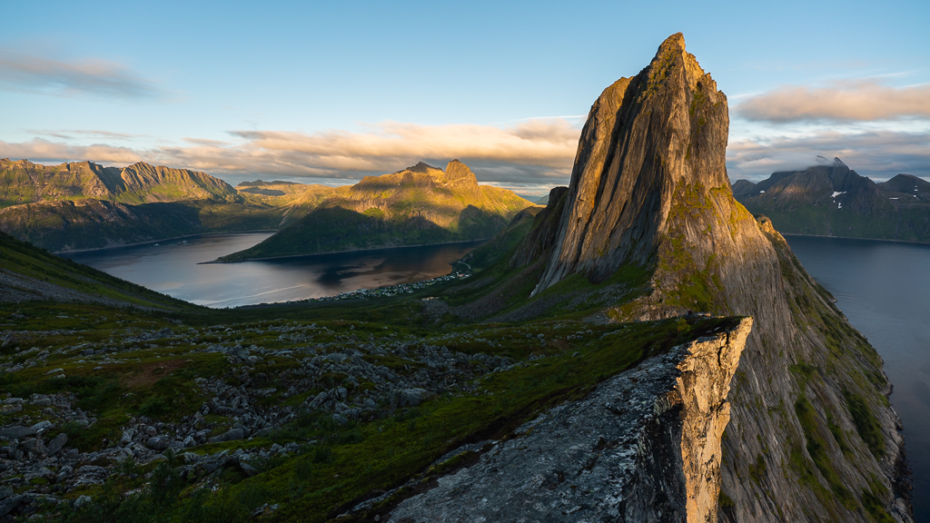 The best view of Segla is from the nearby Hesten mountain. The trail to Hesten starts at Fjordgård, a small fishing village in the northern part of Senja. The official parking lot is located next to the school. The trail is moderately difficult and rather short but quite exhausting (about 2.5 km length one-way and 500 m altitude gain). We needed about two hours to get to the top of Hesten, but most people are quicker.