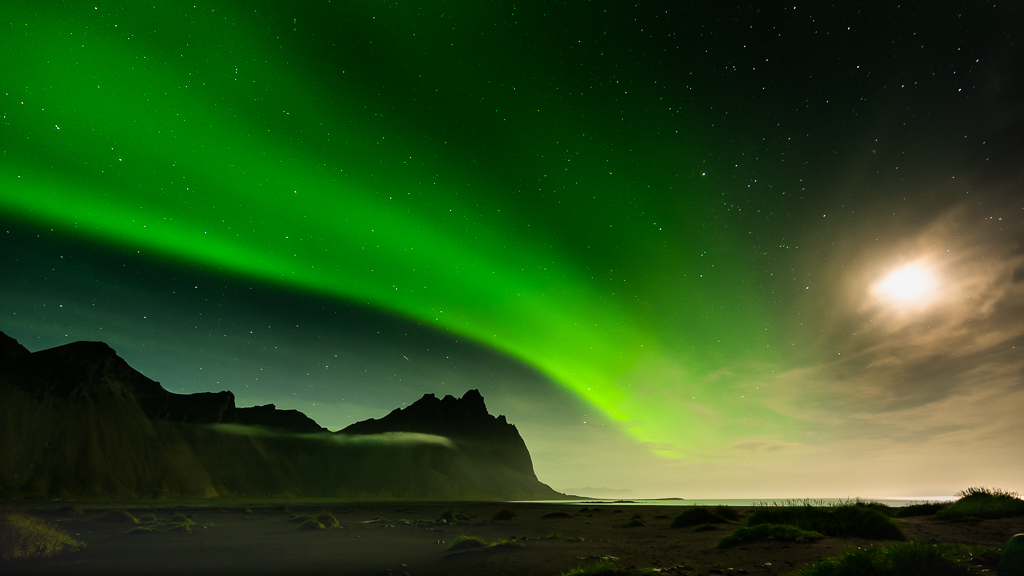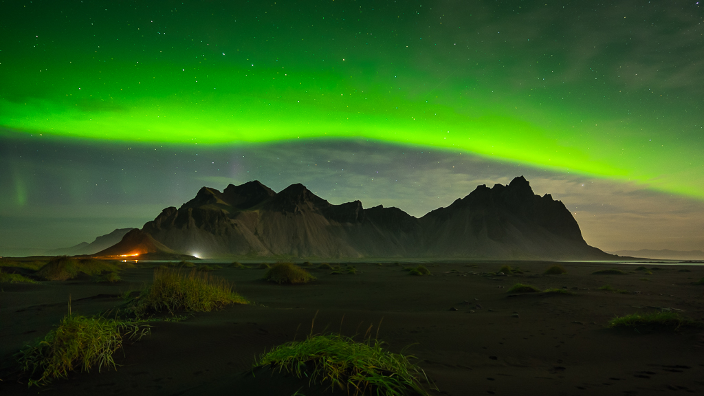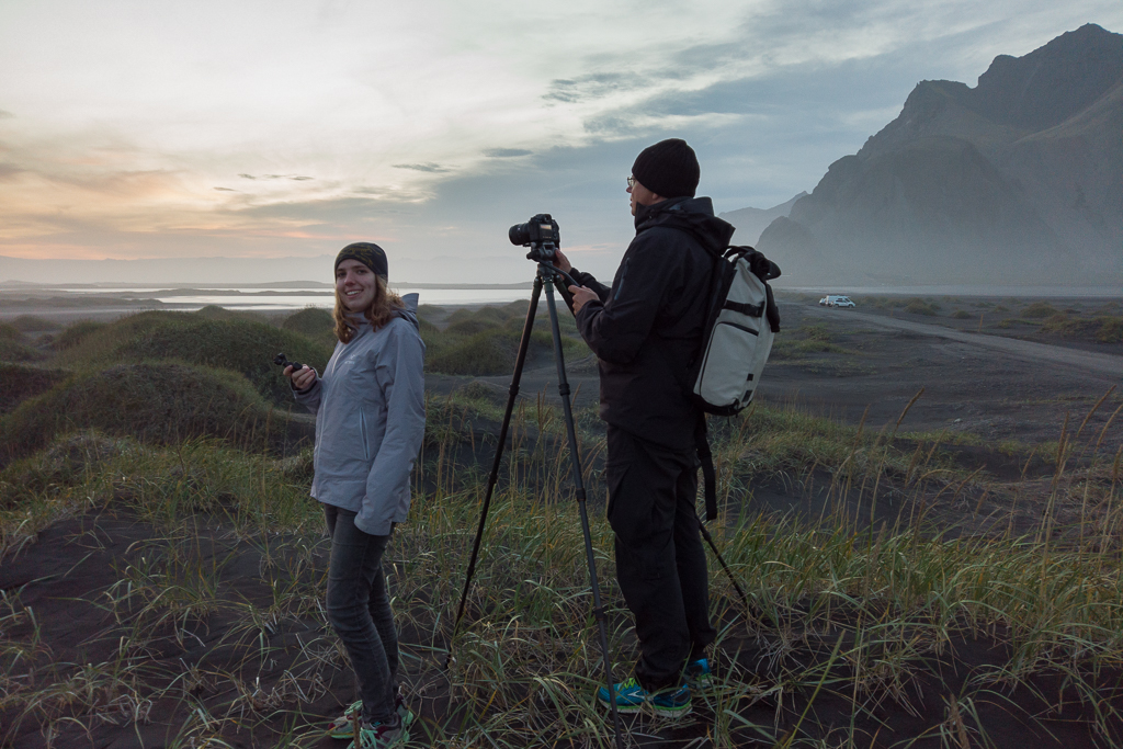 It was already September and the nights were getting longer again. This gave us the chance to chase the Northern Lights at night. Since the weather forecast promised a clear sky combined with a medium solar activity we returned to Vestrahorn at midnight.
