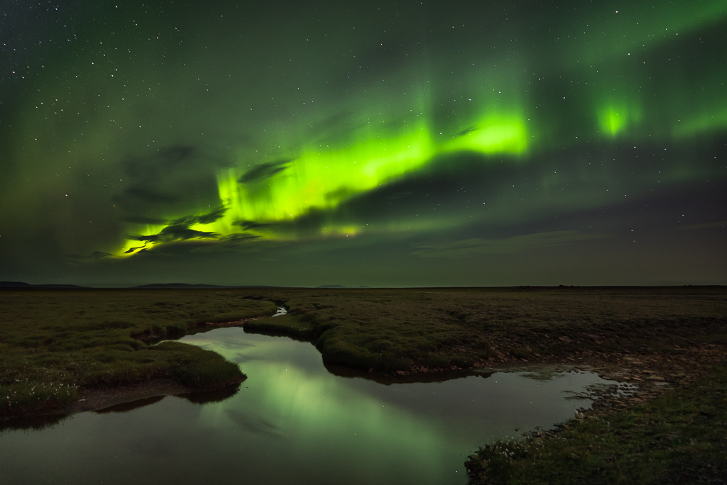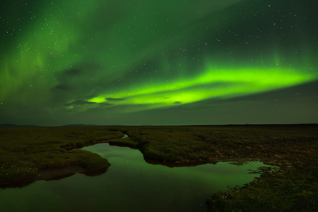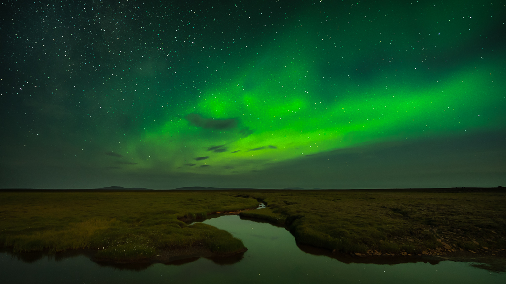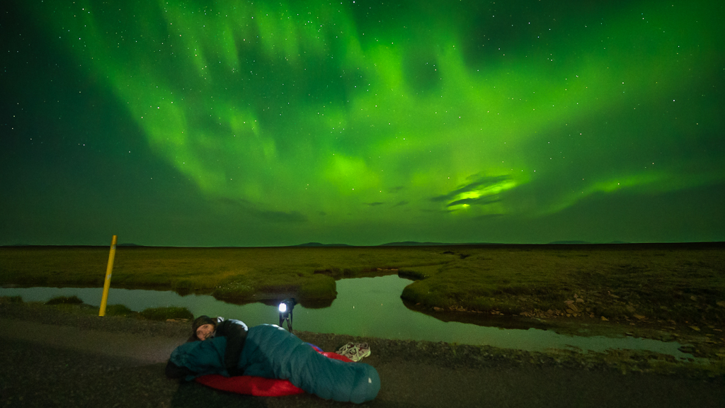 On the next day, we drove from Höfn to Egilsstaðir, where we spent our last night in Iceland. Actually, we didn’t get much sleep at all during this night but instead decided to drive up to the Eastern Highlands along the F910, hoping to see more Northern Lights. Our effort paid off. The Aurora intensity was much higher than on the previous day. In addition, there was absolutely no light pollution in the highlands and we were completely alone there. We even put our sleeping bags directly on the road and just enjoyed the show. A magic experience.