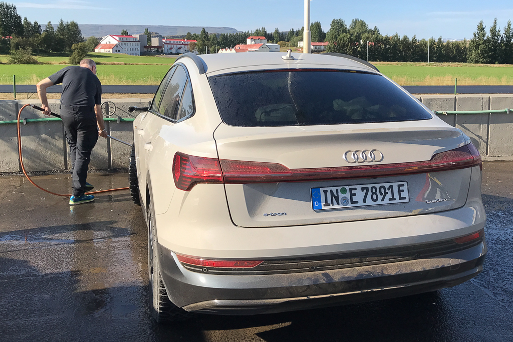 Before driving to Seyðisfjörður we cleaned the e-tron in Egilsstaðir. An interesting fact about Iceland is, that while some things like food and accommodation are very expensive, other things for which you have to pay in most countries are completely free. This includes car wash facilities in nearly every city, many hot pools (including the nice Nauthólsvík swimming pool in Reykjavik), and free charging of electric vehicles at many places.