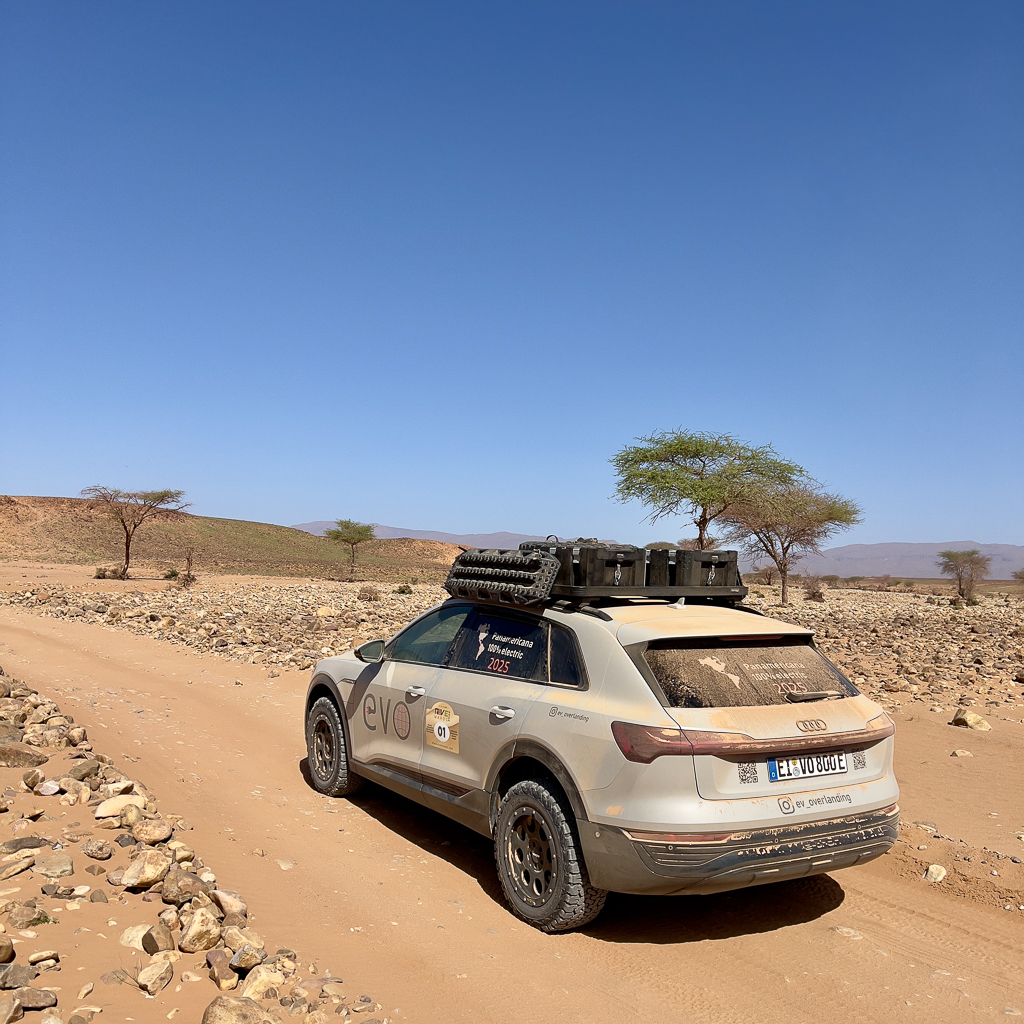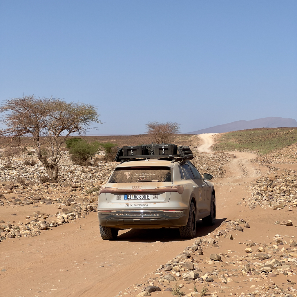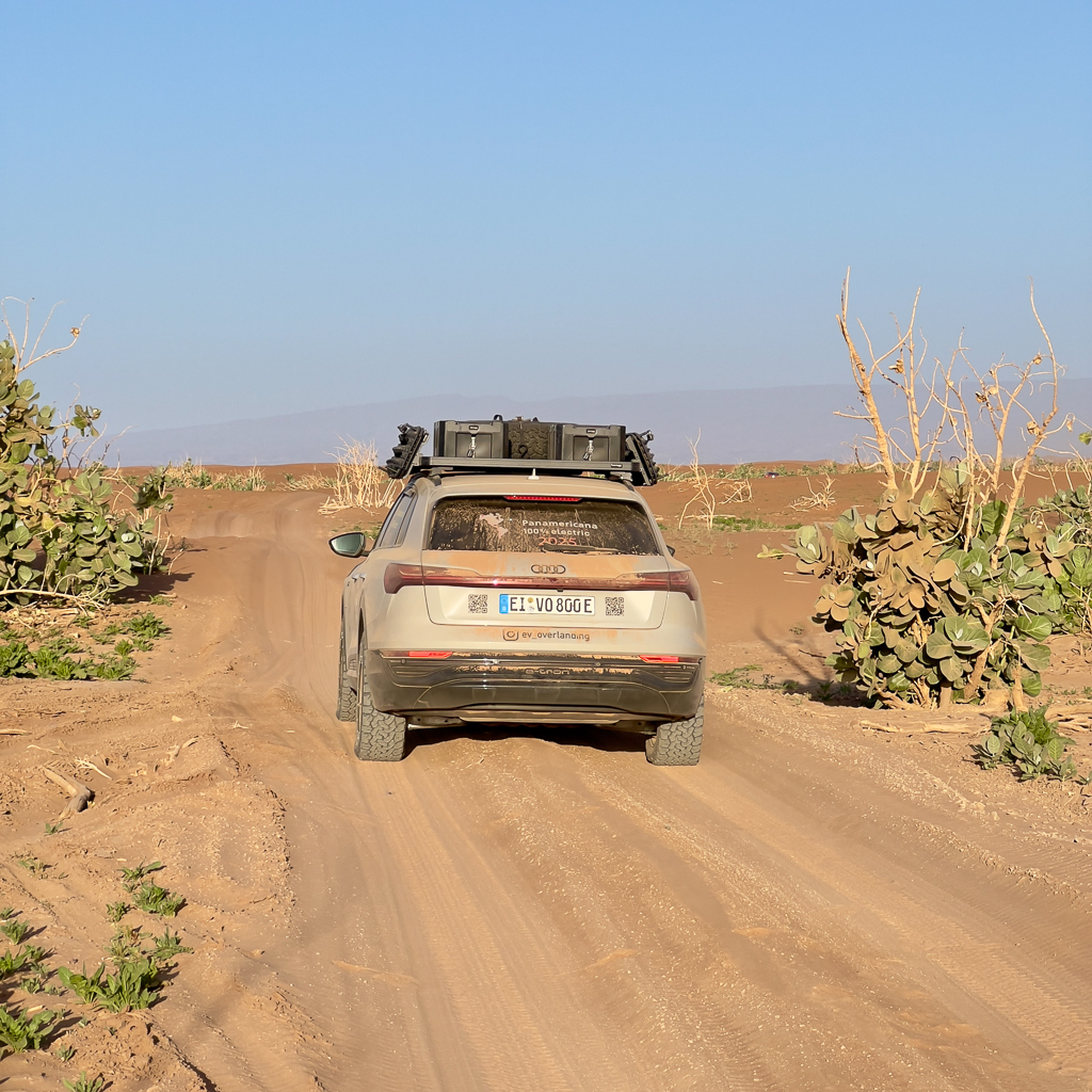 So our Lac Iriki desert crossing was now reduced to only two EV teams: John Otto and Mira with their Tesla Model S and myself with the Audi Q8 e-tron. Here you can check out the YouTube channel of John Otto and Mira.