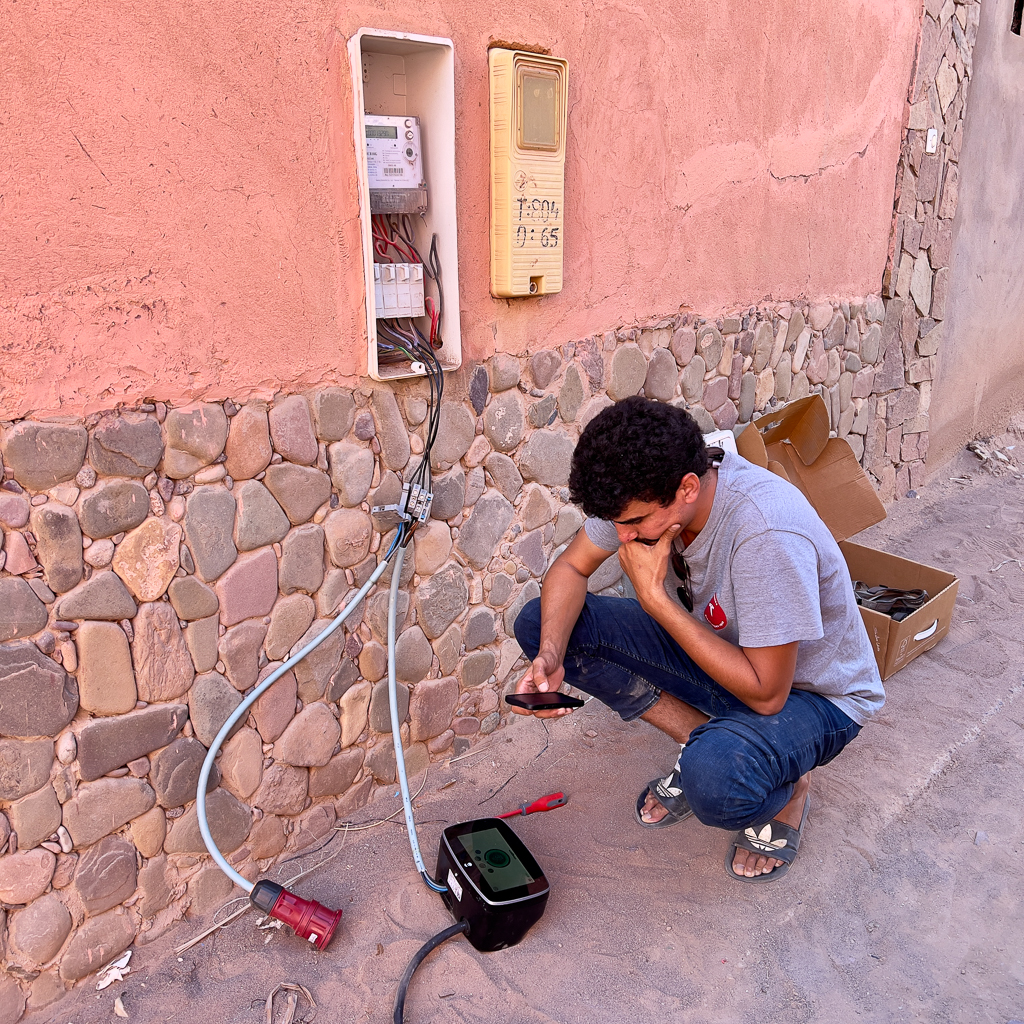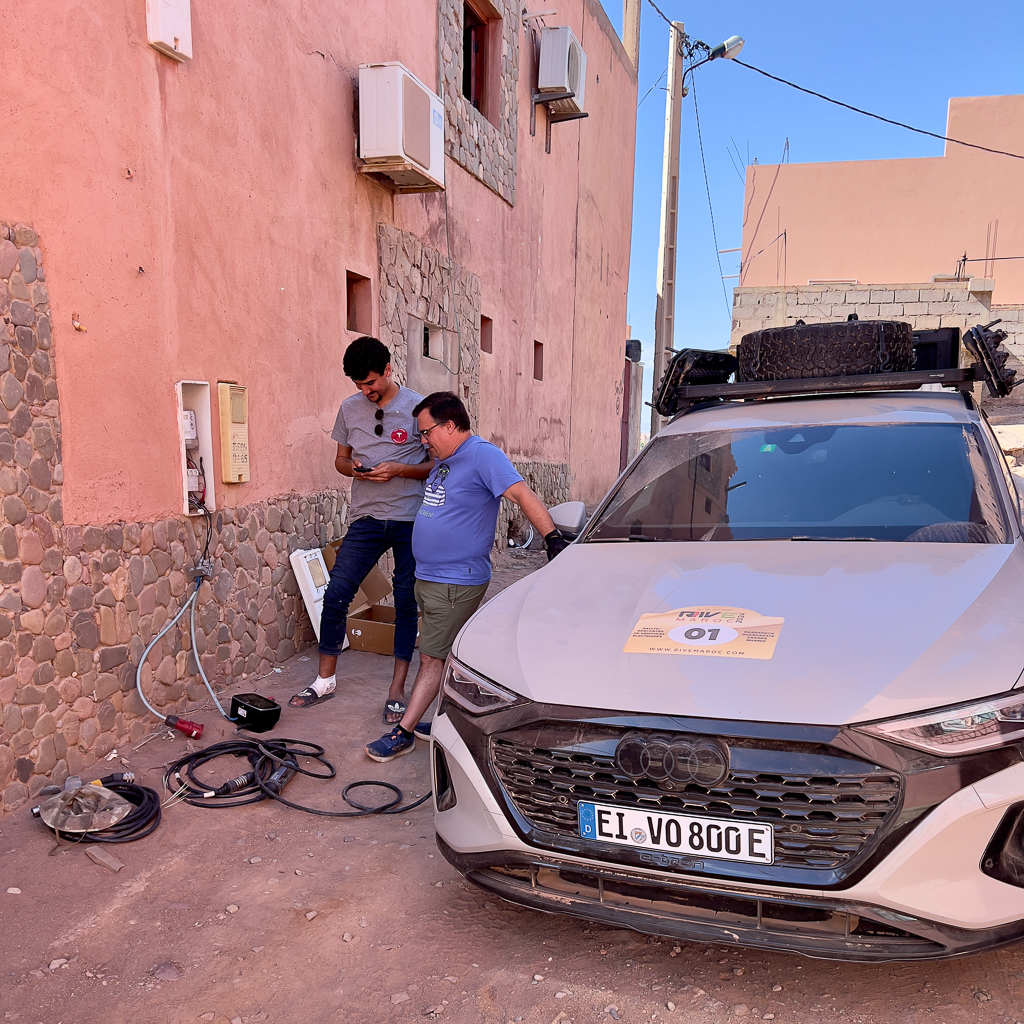 In Foum Zguid there was electricity again and with a bit of help from the Rive Maroc charging team, we were able to charge our cars on a 16 amps connection.