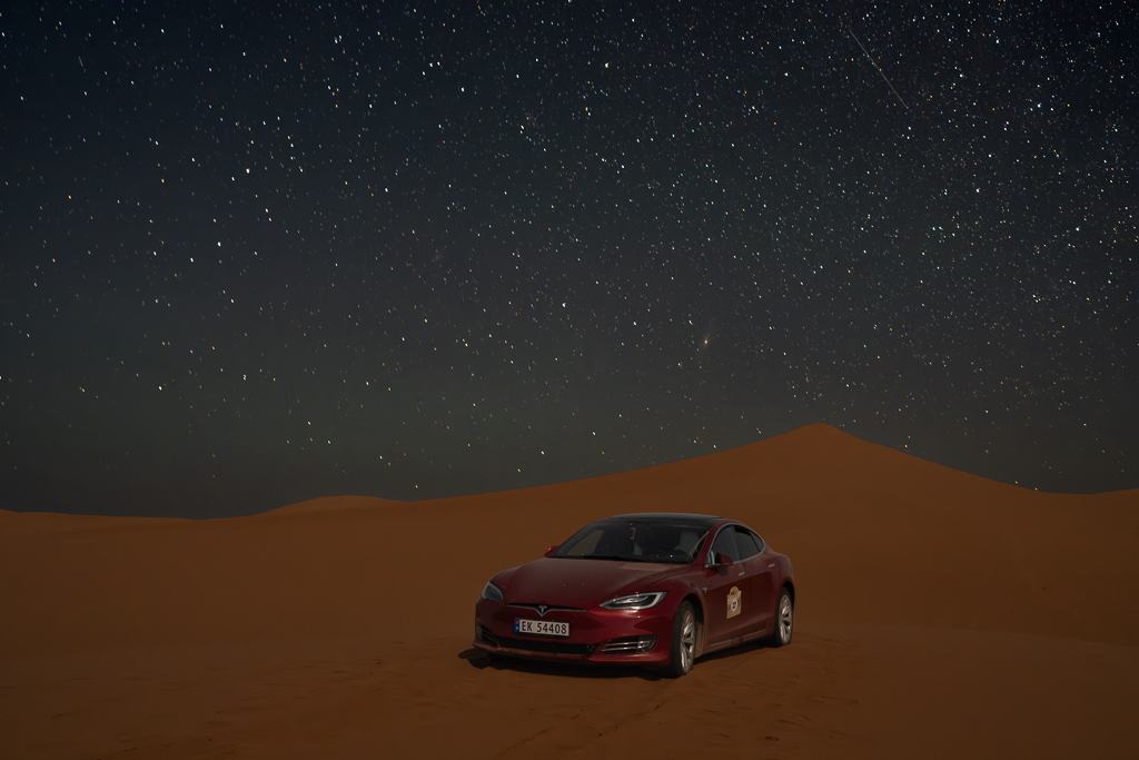 The whole distance across the desert will be around 160km. But completely unknown is the energy consumption in soft sand. It will be high for sure. And there will be lots of sand.
