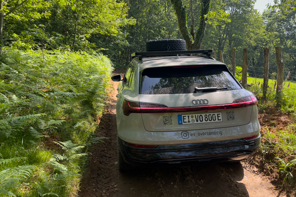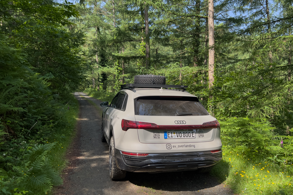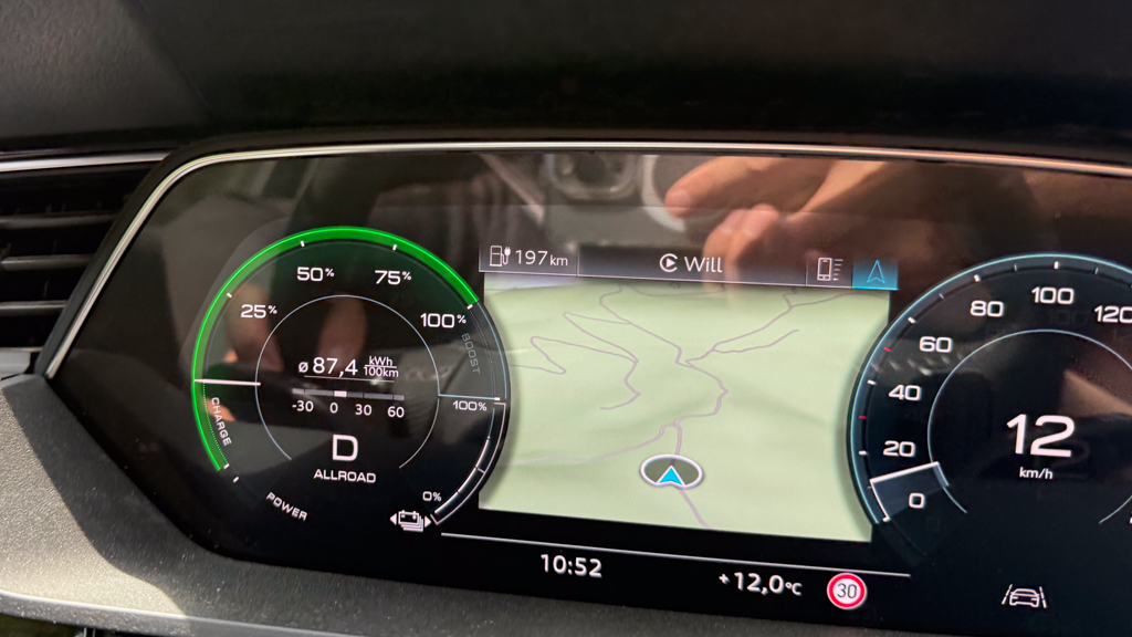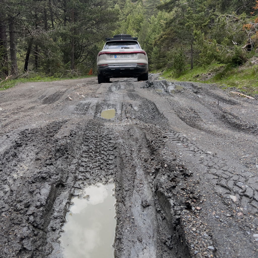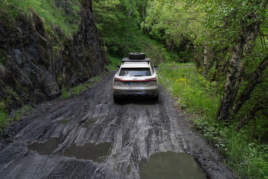 The combination of driving through the mud and some ascents led to an average energy consumption of 87.4kWh/100km on the first section of this track. Even for my Audi, that’s a high value I rarely see.