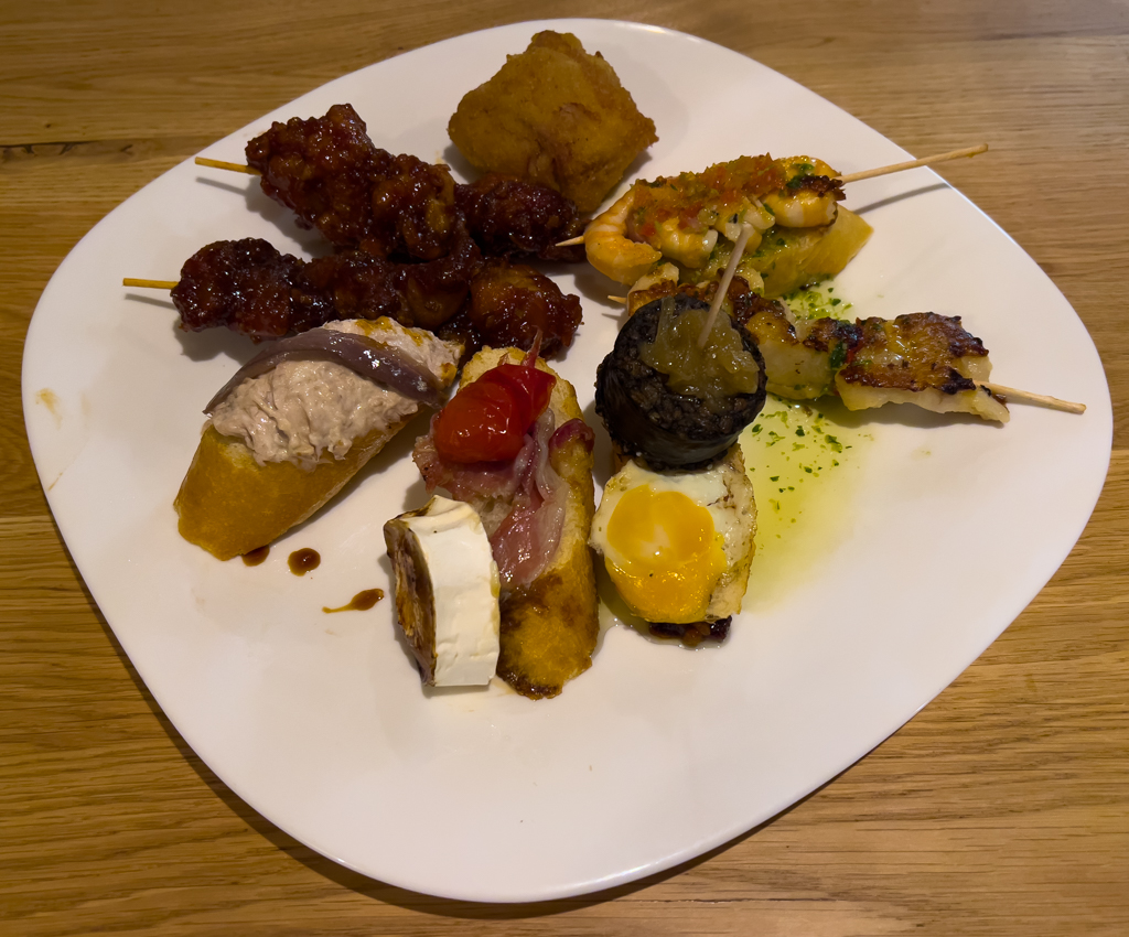 For dinner, we went to one of the countless Pintxos bars in the city center. Pintxos (or Pinchos) are very similar to Tapas.