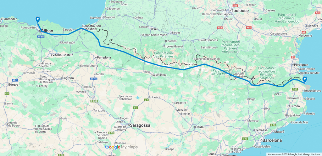 The rough idea was to start at the border between France and Spain at the Mediterranean Sea and then continue along the border through the Pyrenees on the Spanish side (since offroad driving is now mostly forbidden in France) until reaching Bilbao on the Atlantic coast.