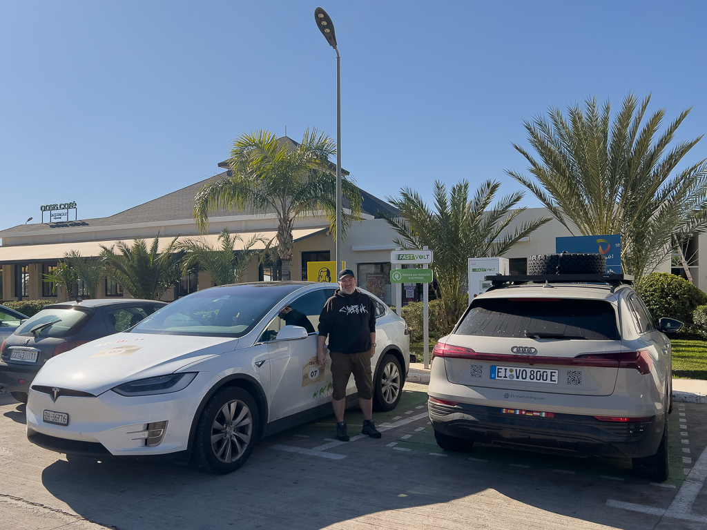 Since there is only one DC charger, we decided to split up again to not lose too much time. Hans charged at another Fast Volt charger north of Marrakech, and we met again at the Targa station.