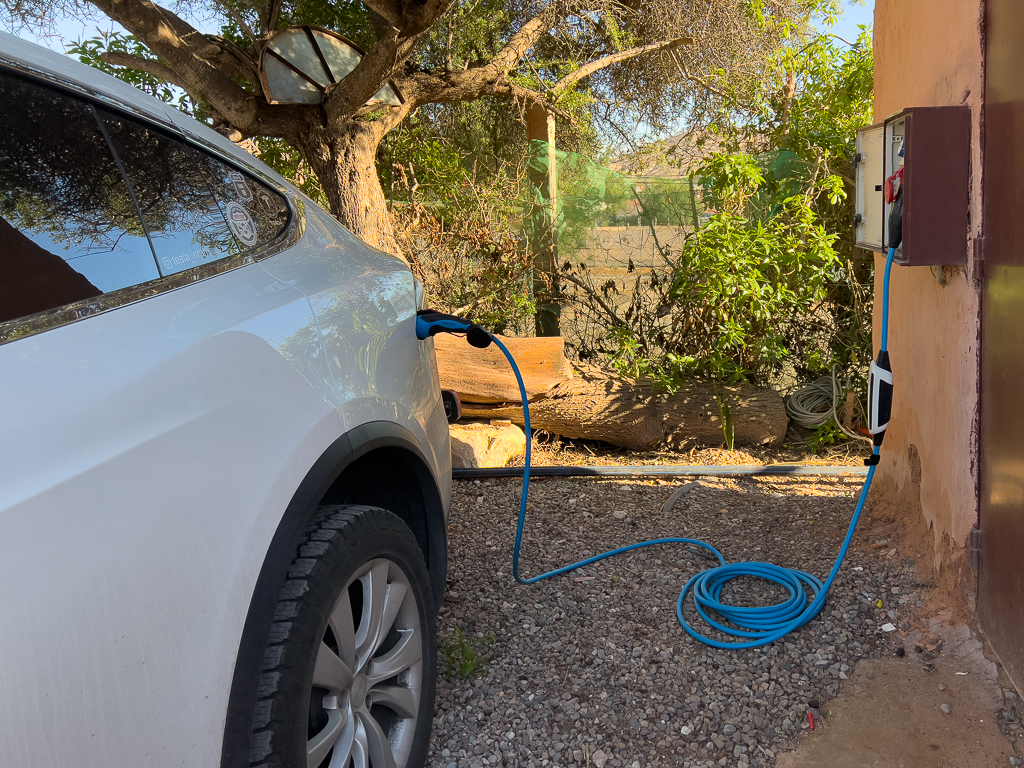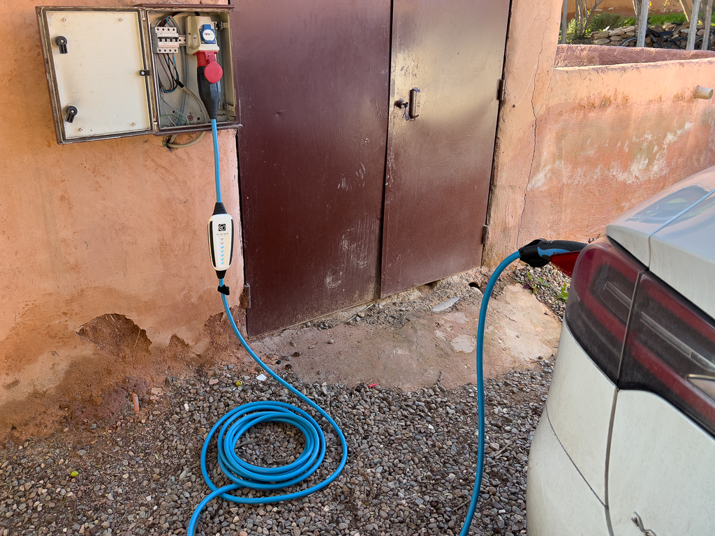 At the Atlas Kasbah, there are two options to charge an electric car. Directly at the entrance is a single-phase wall plug with 13A. That’s where I plugged my car using my Juice Booster.