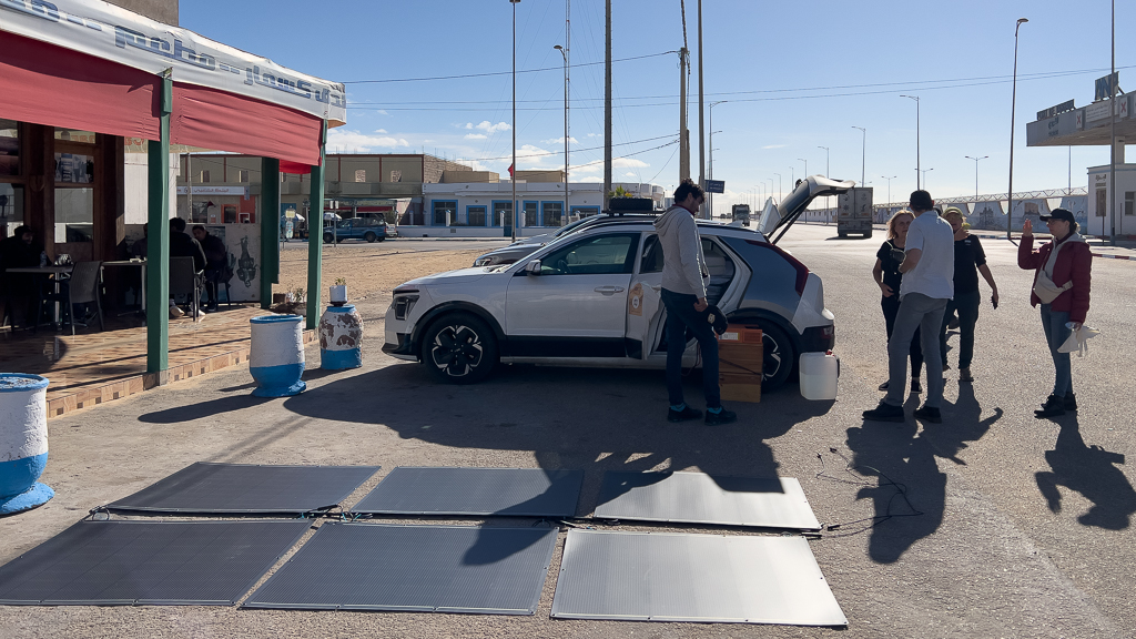 Friedwart was carrying 36 solar panels (200W each) in his Kia to be able to solar-charge on the trip to Dakar. He used our lunch break in Tarfaya to test his solar setup with a subset of panels. With 6 panels, it was working as expected.