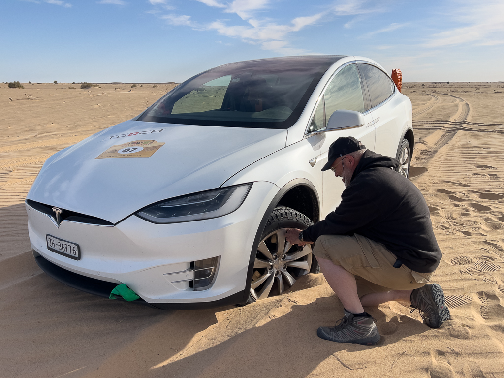 Hans stopped a little bit too early before reaching the dune crest (because he couldn’t see the other side of the dune due to the steep inclination) and got his Tesla stuck again.