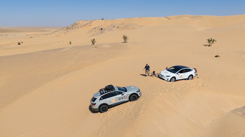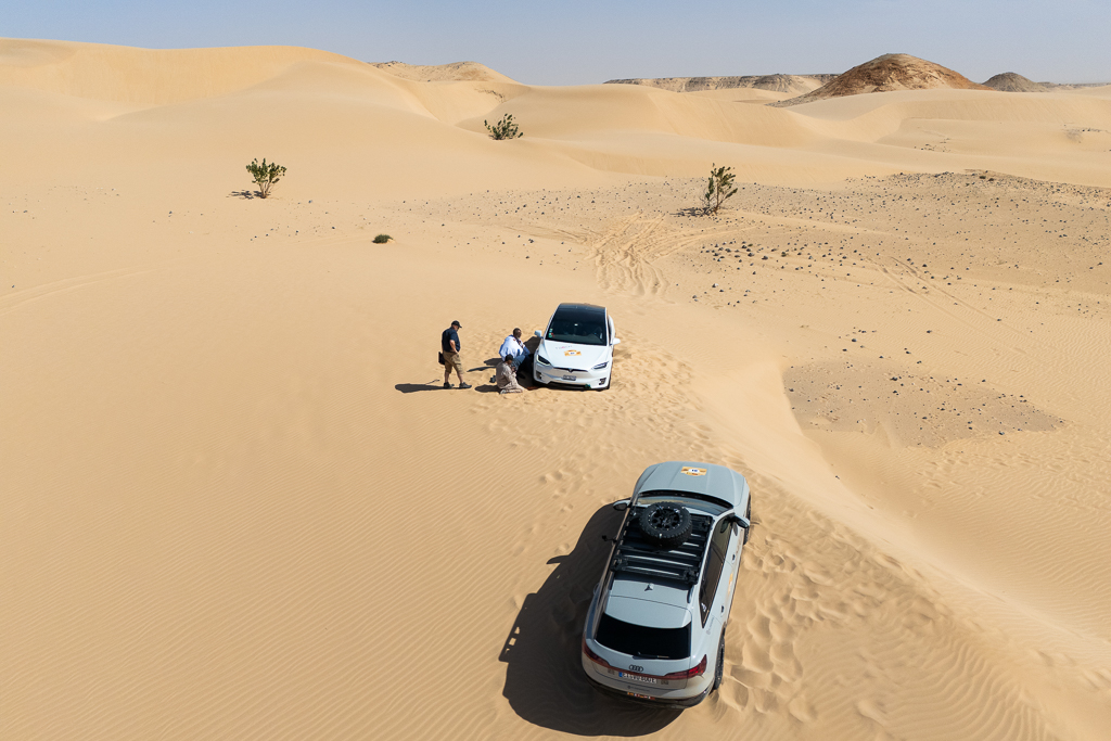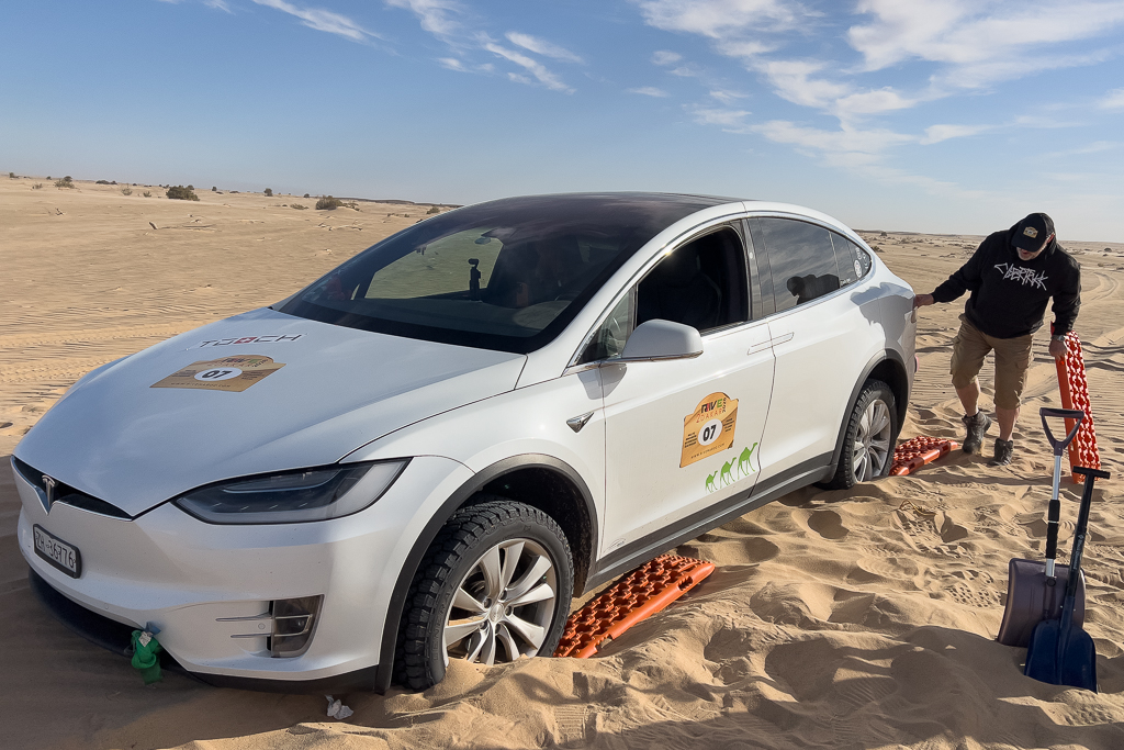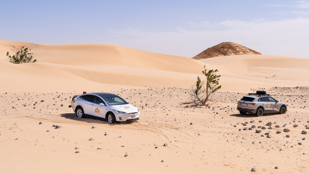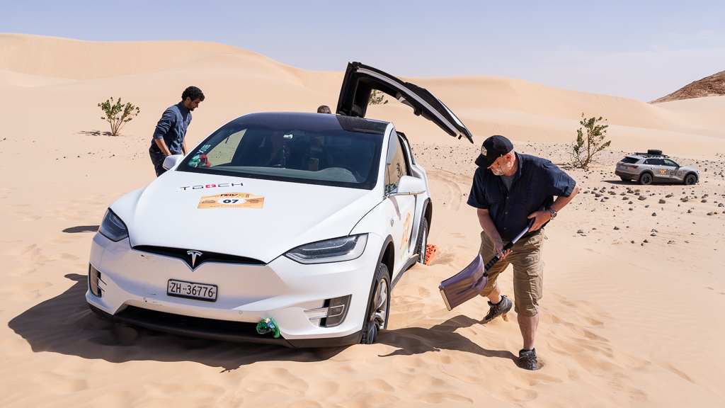 Sometimes this is still not sufficient, as Hans quickly learned. He stopped at a soft section because the car in front of him was suddenly breaking. In soft sand, there’s a huge difference between a moving car and one that has already come to a full stop. As long as a car is moving and you keep pressing the gas pedal, you can get through most soft sections, especially with the high power of modern electric cars. Our cars have between 450 and 600 horsepower, which helps tremendously in this situation.