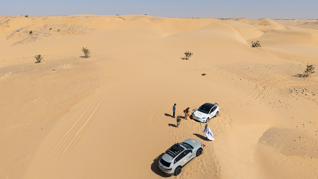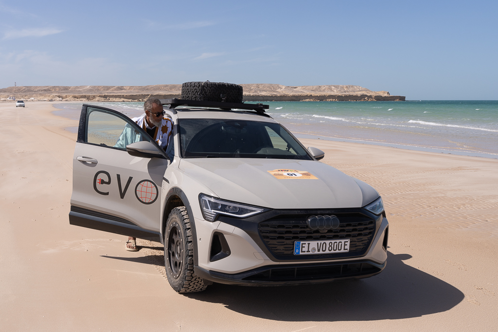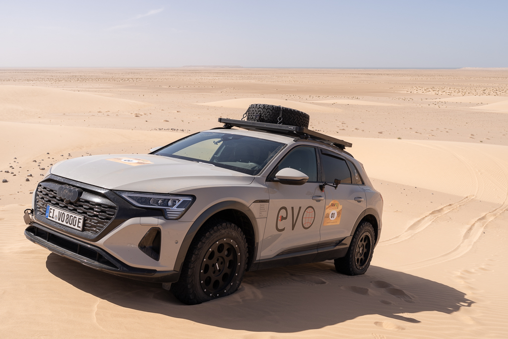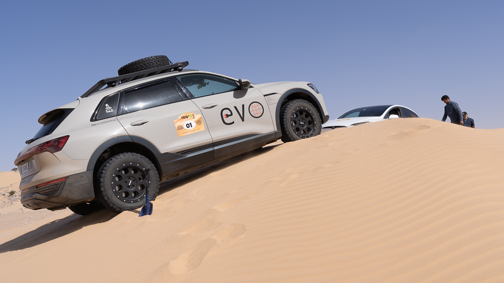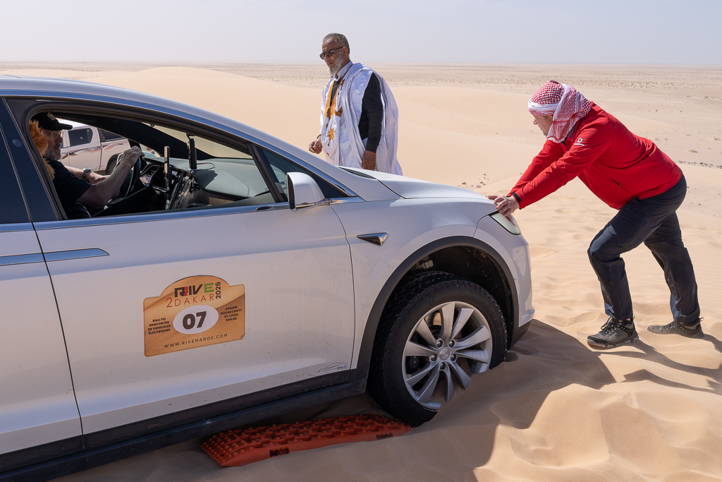 Sometimes this is still not sufficient, as Hans quickly learned. He stopped at a soft section because the car in front of him was suddenly breaking. In soft sand, there’s a huge difference between a moving car and one that has already come to a full stop. As long as a car is moving and you keep pressing the gas pedal, you can get through most soft sections, especially with the high power of modern electric cars. Our cars have between 450 and 600 horsepower, which helps tremendously in this situation.