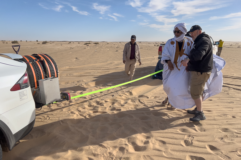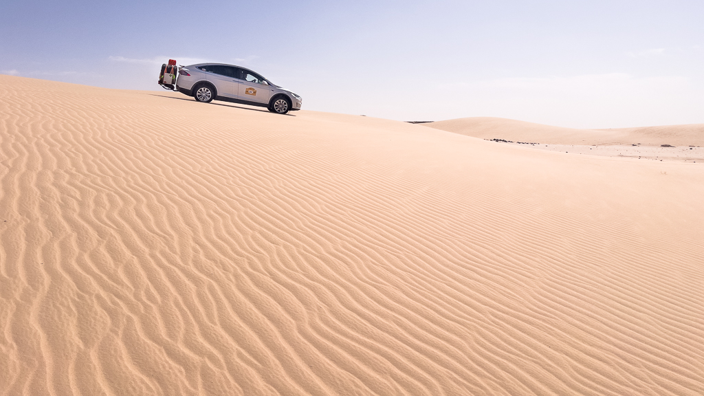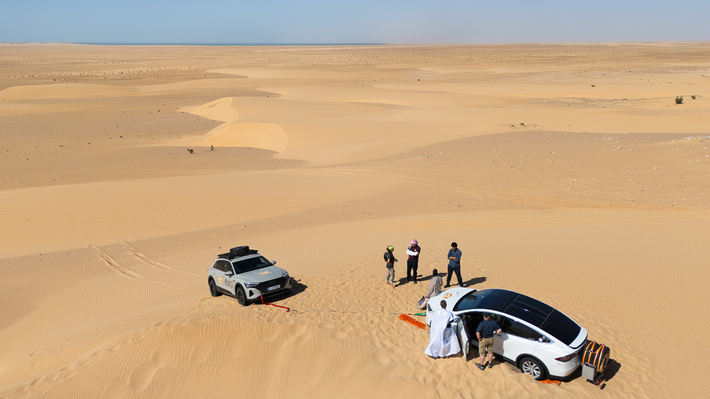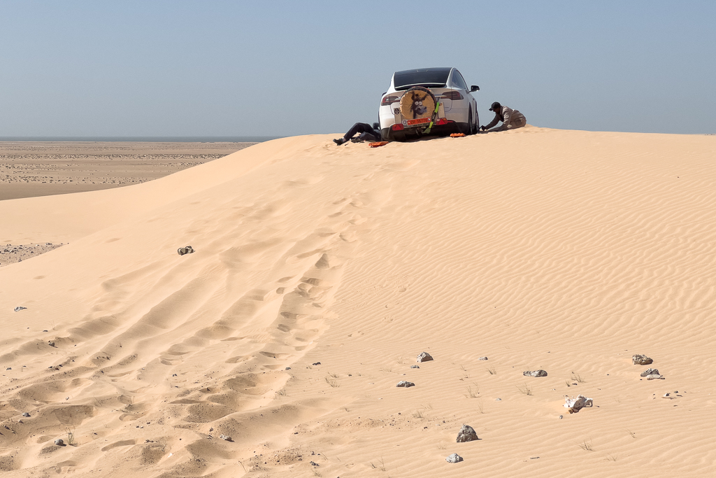 I even tried to pull the Tesla down the dune with my car using a recovery strap. But the result was that my Audi also got stuck. The sand was just too soft and deep.