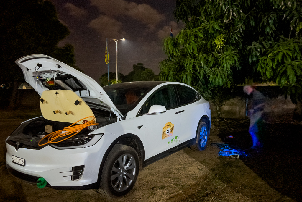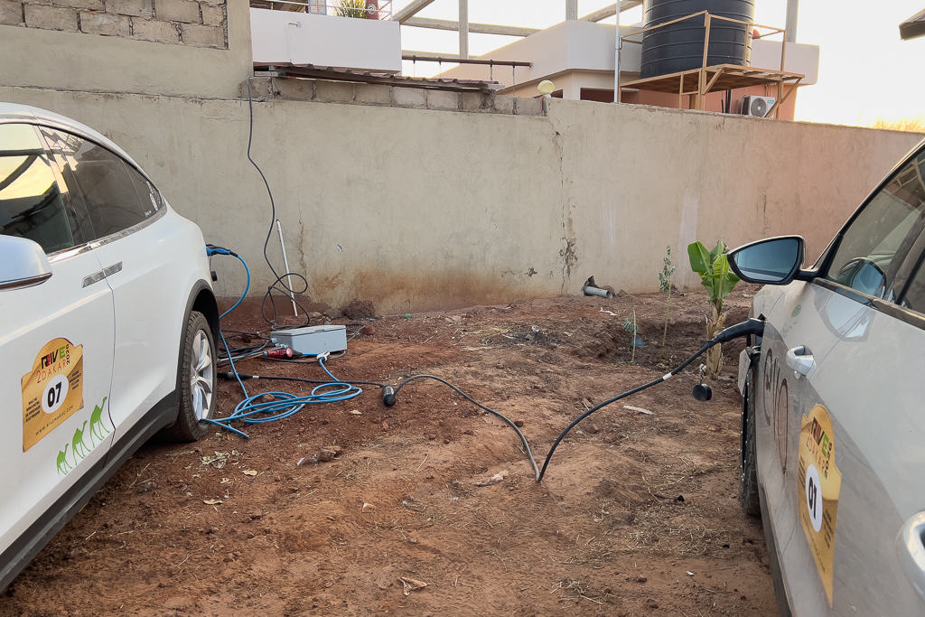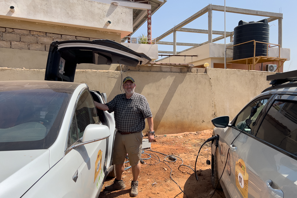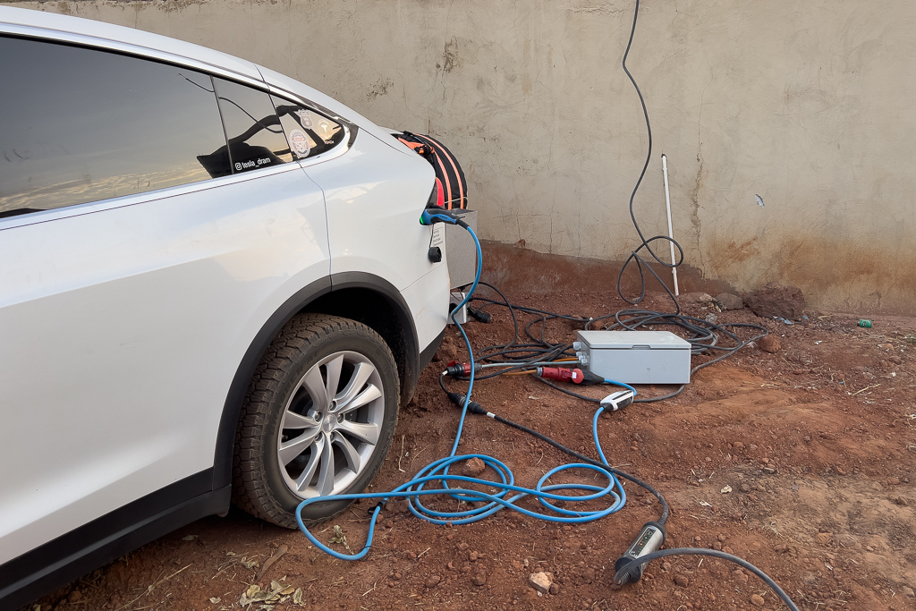 At first, we tried to charge both cars at the same time. But the Tesla stopped charging after just a few minutes. The main problem was the NRG Kick charger that Hans uses (in combination with a less-than-perfect power supply). It is very sensitive to over- and undervoltage. In third-world countries, you often have voltage drops below 210V or peaks over 240V. In both cases, the NRG Kick first ramps down the Amps significantly and then stops charging completely. We had this experience several times on our Dakar trip. Two cars, the Tesla and the Ford, were using an NRG Kick as their main charger, and both had the same problem. The NRG Kick might be a good mobile charger for Europe, but for third-world countries, it’s just unusable. My Juice Booster, on the other hand, worked perfectly under all conditions. It is far more reliable and robust against unusual voltages.