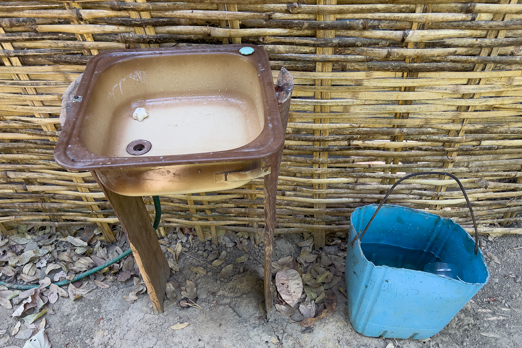 The camp shower consists of just a bucket and a privacy fence.