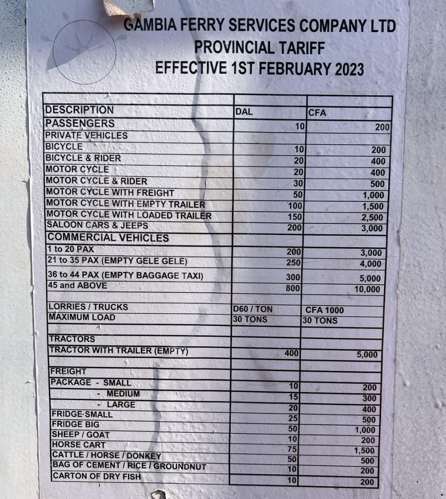 The following price list for the ferry gave us a first indication that this would be very different from any ferry ride in Europe. There were prices for sheep, goats, horse carts, donkeys, bags of rice, or cartons of dried fish.