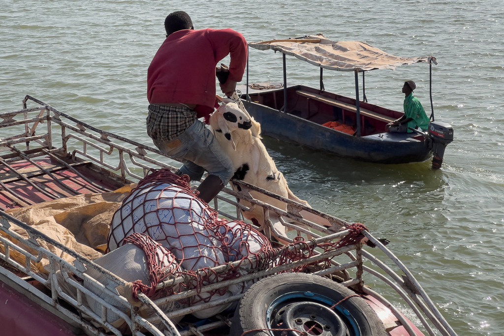 While loading the ferry, someone tried to lift a goat up to the roof rack of the van. It slipped and nearly fell into the river. The guy on the van caught the goat in mid-air in the last second.