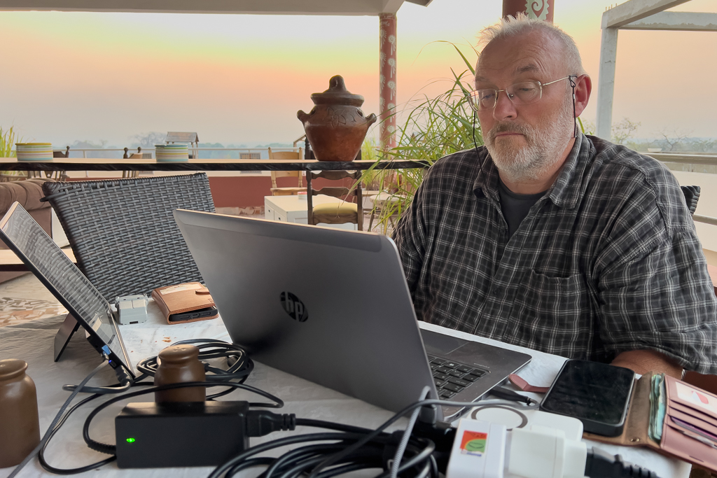 Since we were already back at the hotel in the early afternoon, Hans used the remaining day to get some work done and installed his 2-display setup in the hotel restaurant.